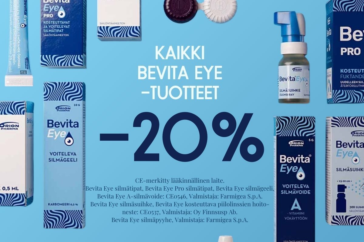 Lievän ja keskivaikean kuivasilmäisyyden hoitoon sopivat Bevita Eye -silmätipat. Ne kosteuttavat ja suojaavat silmän pintaa ja sopivat myös piilolinssien kanssa käytettäväksi. Vaihtoehtoina 10 ml pullo ja 20x0,5 ml uudelleen suljettavissa pipeteissä.