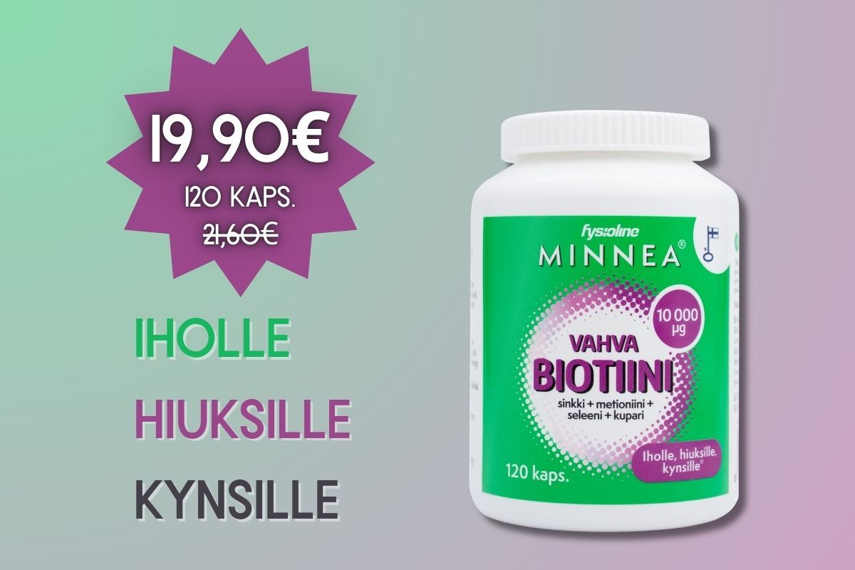 Minnea Vahva Biotiini sisältää vahvan annoksen biotiinia, joka tunnetaan parhaiten siitä, että se edistää ihon, hiusten ja limakalvojen kuntoa. Sinkki ja seleeni edistävät kynsien pysymistä normaaleina.
