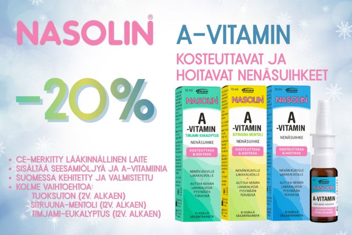 Nasolin A-vitamin nenäsuihkeet ovat kosteuttavia ja hoitavia nenäsuihkeita kuivan ja karstaisen nenän hoitoon.